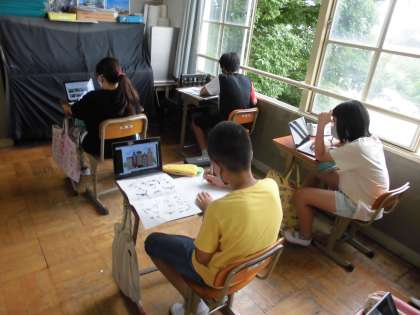 図工の時間には,「ネコのミヌース」という物語から想像を広げ,お話を絵にするコンクールに向けての学習をしています。また,「ネコのミヌース」の物語は,映画化されているお話でもあり,物語のストーリーをイメージするために映像を観たり,タブレットを使ってオランダの街並みや猫の様子などを調べたりもしました。子どもたちは,人物の動きや猫の動きや様子,描きたい場面の様子など,自分の想像を膨らませ,自由な発想で構図や表現の工夫をしながら描いています。