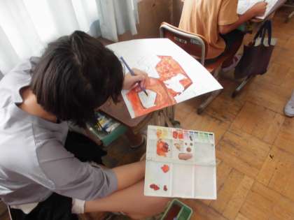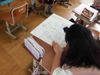 図工の時間には,「ネコのミヌース」という物語から想像を広げ,お話を絵にしています。人物の動きや気持ち,猫の動きや様子などを工夫し,描きたい場面の様子を自分の想像を膨らませ,自由な発想で構図や表現の工夫をしながら描き進めていきたいと思います。