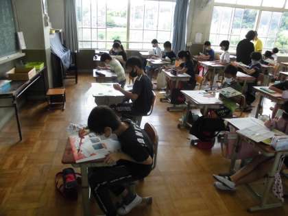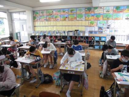 図工の時間には,完成に向け一生懸命に頑張っています。今回の作品では,猫の様子や建物の様子などの写真をタブレットを使って調べて参考にしたり,猫の動きを表すことができるように猫のイラストなども参考にして描いてきました。物語からイメージを広げ,動きのある様子や猫たちの気持ちが表現できるように工夫して描くことができました。どの作品も自分の思いがしっかりと表現できてきているように思います。