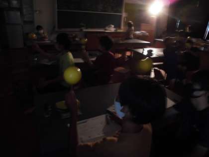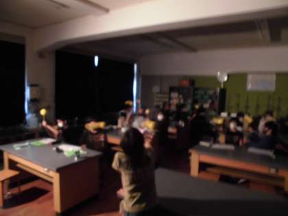 理科の学習では,月の形とその変化について学習しています。今日の理科の学習では,月の形の見え方と太陽の位置の関係を調べました。子どもたちは,暗くした理科室の中で,月に見立てた発泡スチロール球をもち,太陽に見立てたライトの光の当たり方によって,光が当たっている部分の形の変化を確かめました。実際に試してみることで,月の満ち欠けを感じることができたようです。