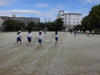 運動場の体育は,ハードル走を練習しています。自分に合ったインターバルを意識しながら,リズムよくハードルを越えていく姿が見られました。次回は,少しハードルを高くして挑戦していく予定です。