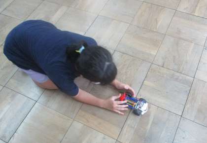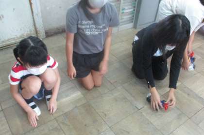 モーターカーを作り,直列つなぎと並列つなぎ,電池1個のときの3パターンで競争させました。直列つなぎのモーターカーが一番速く,並列つなぎと電池1個は同じくらいの速さでした。