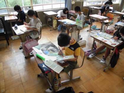 図工の時間には,「ネコのミヌース」という物語から想像を広げ,お話を絵を描き進めてきました。子どもたちは,建物の色や屋根の様子,人物の動きや猫の動きや様子など,色の塗り方にを工夫をしながら完成に向けて頑張っています。