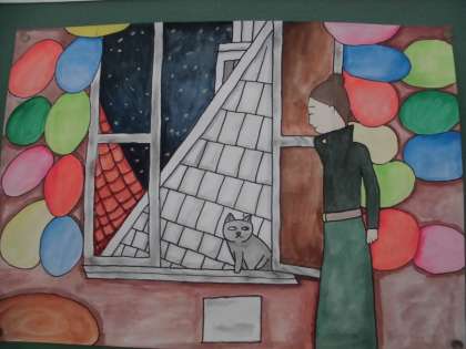 図工の時間には,「ネコのミヌース」という物語から想像を広げた,お話を絵が完成してきました。子どもたちは,人物の動きや猫の動きや様子,描きたい場面の様子など,自分の想像を膨らませ,自由な発想で構図や表現の工夫をしながら描くことができました。