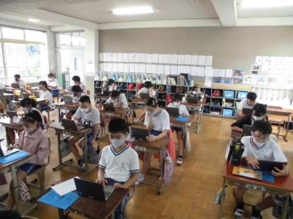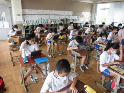 貴族が中心の平安時代から武士が活躍してくる鎌倉時代までの学習のまとめをしました。多くの人物が登場し,色々な出来事があるので,時代の流れや世の中の様子なども想像しながら学習を進めてきました。また,テスト対策として,タブレットを使って色々な問題で復習をしました。また,資料集なども活用しながら問題をじっくりと考えて解いている姿も見られました。