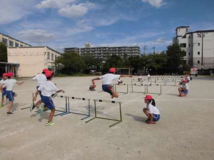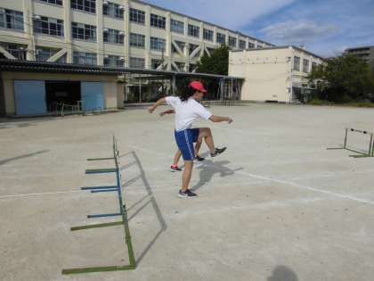 50mハードル走では,5年生の時よりも5cmど高いハードルに挑戦します。飛び越える姿勢やインターバルに気を付けてスピードを上げて跳ぶことができるようになってきました。また,4.5m・5m・5.5m・6mの4つの中から跳びやすいインターバルを選ぶ形でハードル走をする予定です。ベストの記録が出るように頑張ってほしいと思います。