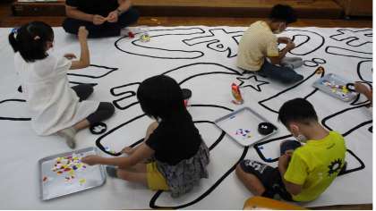 相当大きな紙に,小さな紙を一切れ一切れ,色やバランスに気を付けながら,貼りつけていきます。