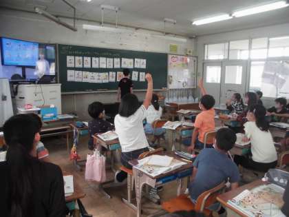 前でジェスチャーをしてくれる人を募ると,たくさん手が挙がり,積極的なところがこの学年のとても良いところだと思います。
