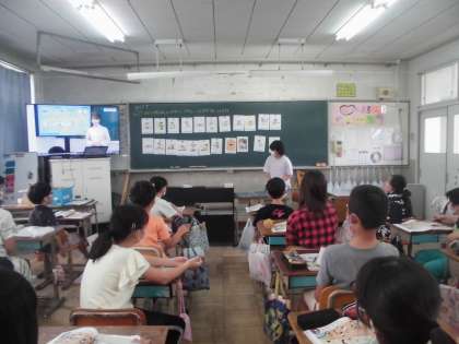 などの表現を学習した後,ジェスチャーで示されたものを英語で答えるという学習をしました。