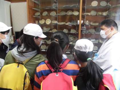 「伏見桃山探検」で初めに訪れたのは,御香宮神社です。子どもたちは,七五三やお祭りなどでもよくお参りをしたことがあるようです。今回は,特別に指月桃山城の瓦などの展示も見せていただきました。本物から伝わる歴史の重みや今とは違う瓦の色から,今までに以上に伏見の魅力を感じることができたように思います。