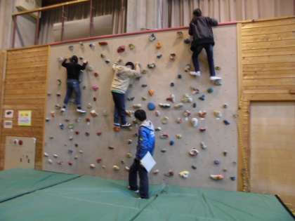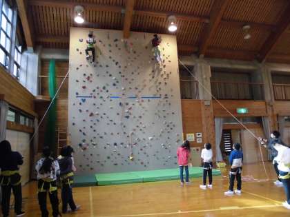雨が降ってきたため,フライングディスクゴルフは実施せずに,リードクライミングを体育館で行いました。チャレンジ精神に火がつき,何度も挑戦する姿が見られました。