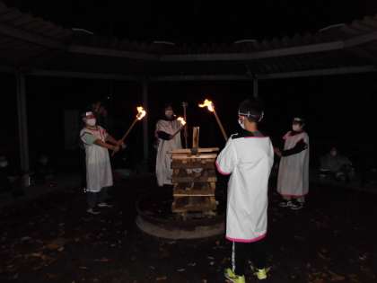火の神々が点火してキャンプファイヤーの火が灯り,スタートしました。