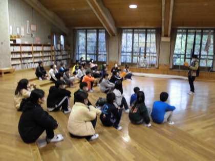 寝具をきちんと片付けた後,朝のつどいをオリエンテーションホールで行いました。