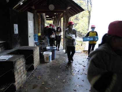山の家の最後を飾る待ちに待った野外炊事の時間です。 まずは,所員さんの説明を聞き,活動を開始しました。