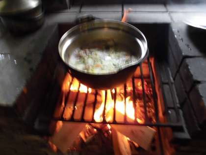 火加減をみながら,おいしい豚汁と炊き立てごはんを作っています。
