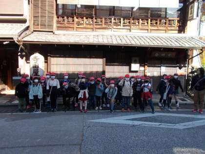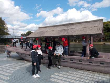 寺田屋前から「坂本龍馬像」を見ました。その後,伏見港の西岸に泊まっている船にのって休憩しました。