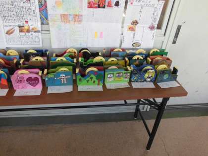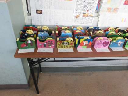 図工の学習で作成したセロテープカッターを展示しています。電動のこぎりを使って形をデザインすることや絵の具で色を付けること,やすり掛けをすることやねじを使って部品を固定することなどいろいろな作業がありました。また,ニス使って木をきれいに仕上げました。自分で使うったオリジナルのテープカッターをぜひお家で使ってほしいと思います。