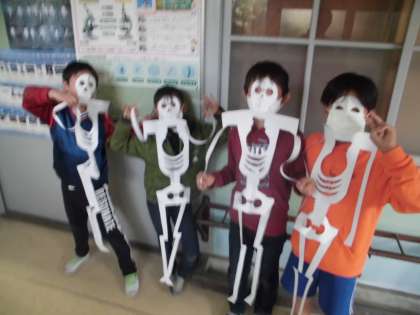 今回の科学クラブでは,骨格標本から体の関節のことや骨の大きさなどについて話し合いました。その後,はさみを使って紙を切り,がいこつくんを作りました。みんな嬉しそうに作っている姿が見られました。