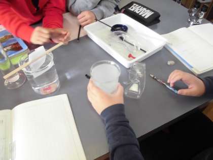 食塩が溶けていく様子を観察実験した後に,かたくり粉を水に入れる実験をしました。子どもたちは,食塩と同じようにとけると予想していましたが,白く濁る様子やしばらくすると白い粉が沈殿していく様子に驚いていました。理科の学習では,実際に自分たちで確かめることを大切にしていきたいです。
