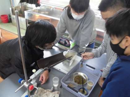 地層はどのようにできるのだろうという学習問題から,流れる水の働きと地層のでき方を調べました。子どもたちは,砂や泥などを混ぜた土を流して実際に地層ができるのか確かめました。繰り返し水を流すことで,地層のようなしま模様ができました。