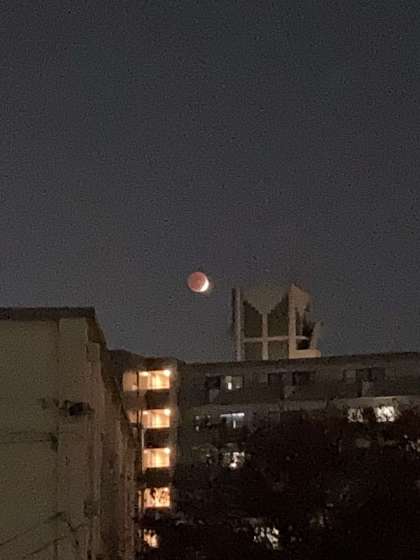 11月19日(金)の5時45分に向島小学校の運動場から東の空を見た様子です。きれいに月の一部が欠けて見える部分月食を見ることができました。今回は部分月食とはいえ月の直径の98%が隠れるため,「ほぼ月全体が隠れる皆既月食に近い」状態だそうです。地球の影に月が隠れるとは,不思議な自然現象です。