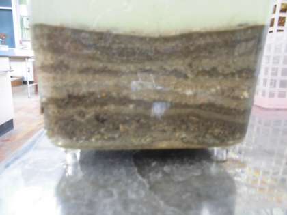 出来上がった地層を見てみると,しま模様がきれいにできていました。実際にモデル実験をすることで,流れる水の働きによって運搬されたれきや砂,どろなどが海底などに層になって積み重なってできることが確かめられました。