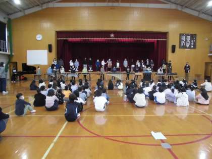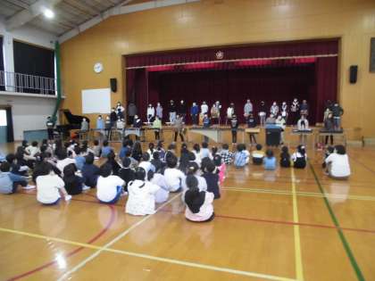 今日のステップ学習の時間に,1年生と2年生にミニコンサートという形で「木星」の合奏の発表会をしました。みんな,指揮をしっかりと見て,心とリズムを合わせていました。そして,木琴・鉄琴・キーボード・鍵盤ハーモニカなどの楽器のハーモニーが体育館に響いていました。低学年のみんなの思い出に残る合奏ができました。
