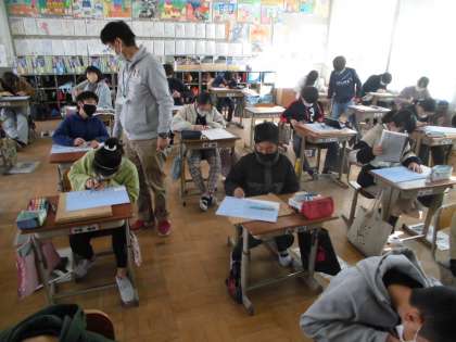 図工の学習では,版画に取り組んでいます。作品のテーマは,「見てみたい景色」というテーマで,世界遺産の建物や実際に訪れてみたい観光地を表現しようと取り組んでいます。題材は,タブレットを使って調べたりもしました。世界中の素敵な建物や日本にある歴史的な建造物などを彫刻刀で表現するように,線彫り・面彫りを組み合わせて彫っていこうと思います。