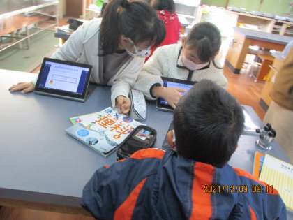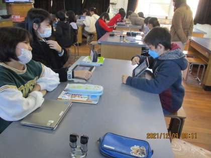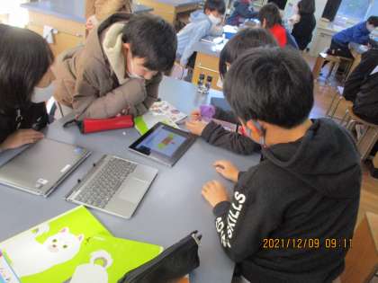 タブレットを使って,班の子たちに自分の予想とその理由を紹介しています。