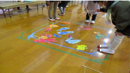 体育館で,自分たちが作ったお店屋さんを並べて,みんなで遊びあいました。