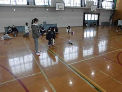 図工の時間に作成した「ドリームカー」を体育館でみんなで走らせて遊びました。ゴムの力をうまく使って進む車やまっすぐにきれいに進む車,なぜか進んだ後に戻ってきてしまう車など,色々な車がありました。みんな楽しそうに車を走らせていました。