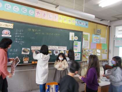 北山先生の授業「おせち料理について知ろう」を楽しみにしていた3年1組の子どもたちは,お話をとてもよく聞きました。おせちの中には,どんなものがあるのか,その意味などたくさん学ぶことができました。