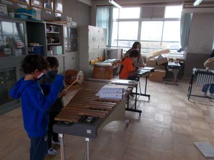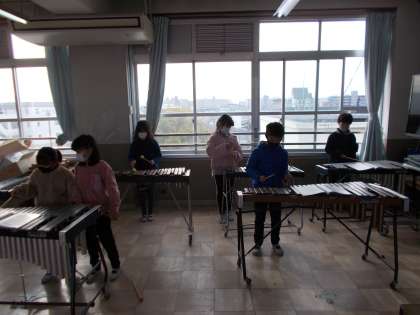 「パフ」の演奏で鉄琴と木琴も使っています。ふり返りで,どのように演奏したらよいか考えを出すことができました。