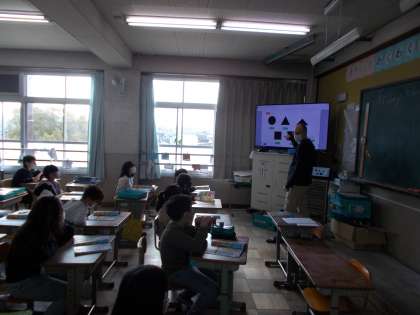 久しぶりにALTのポール先生に教室に来ていただきました。「形や身の回りの物の言い方を知ろう」をめあてに,形に色をぬりながら英語に親しむことができました。
