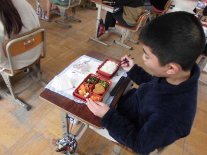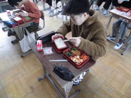 中学校の給食試食体験の日は,行事献立(バレンタインメニュー)という形で特別なメニュー(麦ごはん・カレーコロッケ・ほうれん草とコーンのソテー・野菜の煮物・わかめとツナのさっと煮・ガトーショコラなど)でしたので,子どもたちは大喜びで食べていました。おかずのボリュームや品数も増え,とてもおいしくいただくことができました。