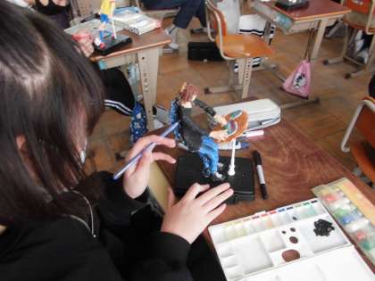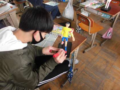 立体作品作りでは,紙粘土で体の部分を作り,机やいすなどを作ったり,動きなどを工夫しながら未来の自分の姿を想像し作っています。子どもたちは,サッカーやバレーボール,バスケットボール,水泳などのスポーツ選手やパソコンを使うお仕事,保育士さんやお医者さんなど,いろいろな夢をテーマに,イメージを広げながら,作品づくりを楽しんでいます。