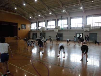 体育の学習では,跳び箱運動に取り組んでいます。開脚跳びや閉脚跳び(かかえこみ跳び),台上前転などの跳び方をきれいに跳ぶことを練習したり,新しい跳び方に挑戦したりしています。久し振りの跳び箱運動でしたので,まず初めに,跳び箱の運動にも生かすことができる馬跳びの練習をしました。馬跳びをすることで,体重の移動や踏み切りのタイミング,手のつき方などを確認しながら,腰の位置が上がりとても上手に跳ぶことができてきました。