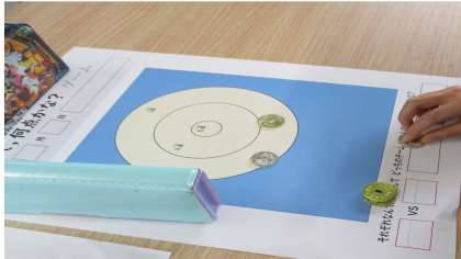 写真の通り,個人戦で,コインをおはじきのようにはじいて,輪に入った点の合計を競います。