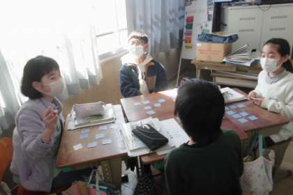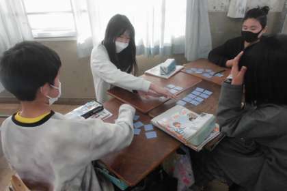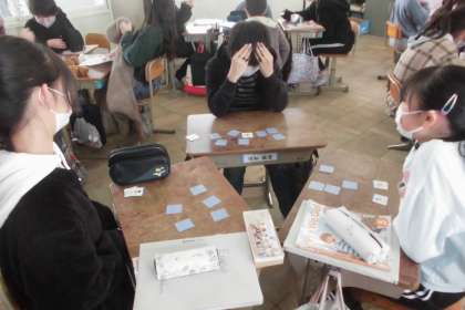 ひいたカードの人の性格を英語で言って,2枚カードをひき,同じカードならもらえる。