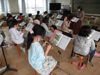 音楽室では,リコーダーの2重奏に挑戦しています。久し振りのリコーダーの練習でしたので,指使いやタンギングに気を付けながら,列ごとの順番で演奏をしました。少しずつ練習をしていき,色々な曲を演奏することができるようになればと思います。