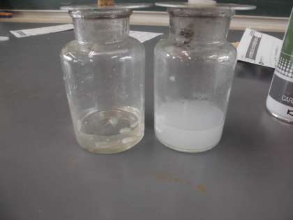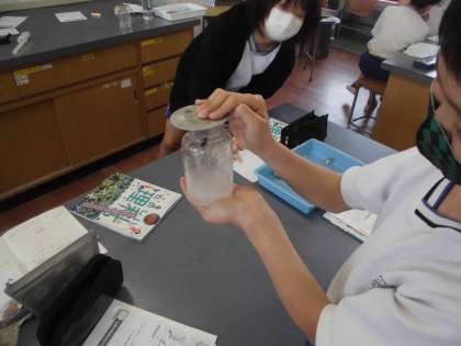 理科の学習では,ものが燃える前と燃えた後の集気びんの中の空気の変化について考えています。子どもたちの予想では,酸素がなくなっていくだろう。酸素の割合が減るだろう。窒素や二酸化炭素が増えるのではないか。といったことが出てきました。そこで,石灰水を使って,二酸化炭素が増えるのだろうかということを調べました。燃えた後の空気では,無色透明な石灰水が白く濁ることに驚いていました。