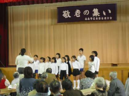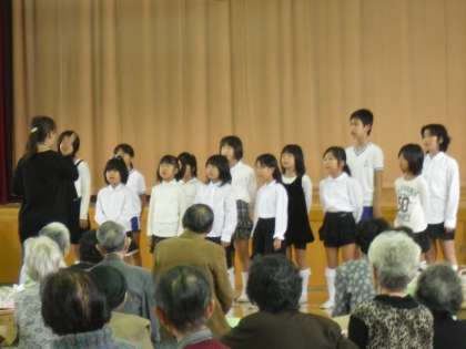 10月30日,向島小学校で敬老の集いがありました。向島小学校からは,鼓笛部とコーラス部(4年生以上)が出演させていただきした。日々の練習の成果を精一杯出しました。特に,コーラス部は,3年生の部員が多く,高学年と力を合わせ歌う姿が感動的でした。