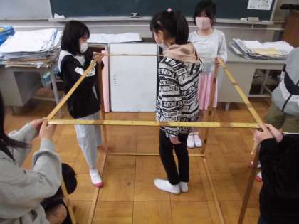 算数の学習では,直方体や立方体の体積を求めることなどを工夫して求めています。また,1立方メートルの大きさについても学習をしています。今日の算数の時間には,1メートルのものさしなどを使って,1立方メートルの大きさをつくる活動をしました。8人くらいが中に入ることができる大きさでした。
