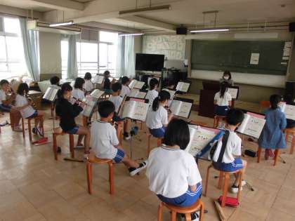 音楽の学習では,リコーダーの2重奏を練習しています。きれいに音が重なり合い素敵なハーモニーが音楽室に響いています。友達の音色を聞きながら,自分の音を重ねることができるようにと思います。