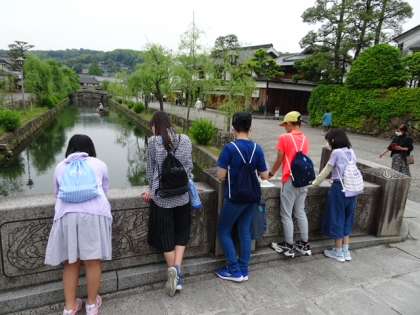 倉敷美観地区で、レトロな街並みを散策しました。お土産を買ったり街の風景を眺めたり、班ごとに行動しています。
