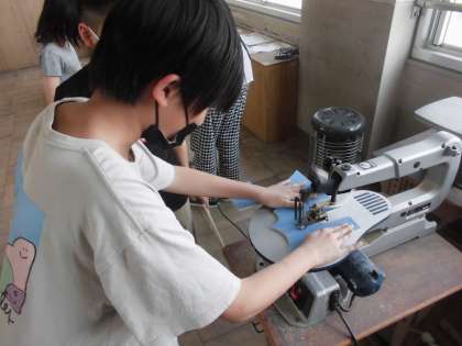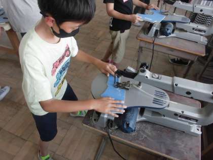 図工の学習では,電動のこぎりを使って伝言板を作り始めています。今日は,電気のこぎりを初めて使い,薄いベニヤ板を切る練習をしました。子どもたちは,しっかりと板を押さえ,ゆっくりと木を切るように心がけていました。子どもたちのアイデアが広がる作品ができるようにと思っています。