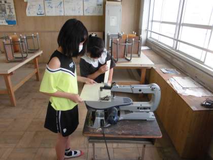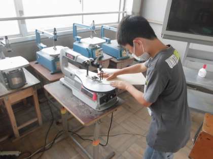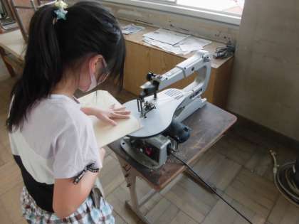 図工の学習では,「伝言板」を作り始めています。伝言板は,ホワイトシートを張ることで,ペンで文字を書いたり消したりできます。今日は,板に鉛筆で下描きをして,電動のこぎりで切るところを太いペンで書いたりしました。また,電動のこぎりを使って板を切りました。前回よりも慣れたようで落ちるいて切ることができていました。