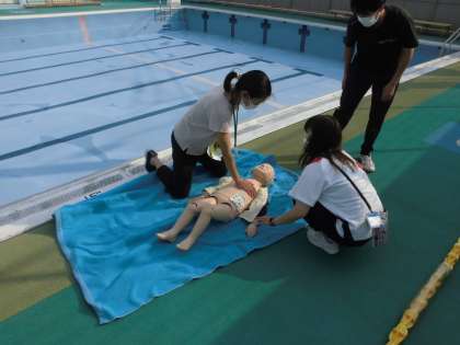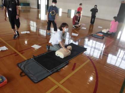 今年度の水泳学習の時期に合わせて,毎年行っている「救急救命講習」を実施しました。まず初めに,体育館で心肺蘇生やAEDなどの講習及び救急救命の動きの訓練などを行いました。その後,プールに移動し,実際の動きを確認しながら,救急救命訓練を行いました。今年度も,事故などがないように,安全に配慮しながら,水泳学習を実施できるように願っています。