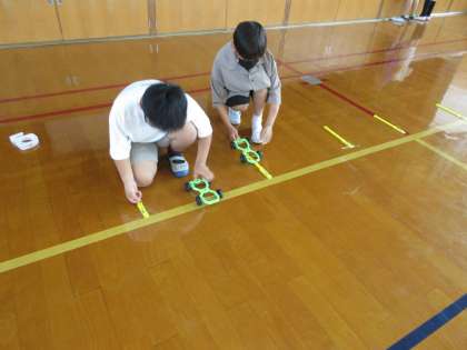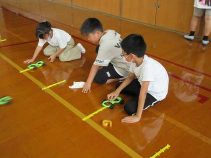 体育館でゴムの力で走る車を走らせました。ゴムを引っ張る長さを変えると,車が動く距離も変わることに気が付いていました。