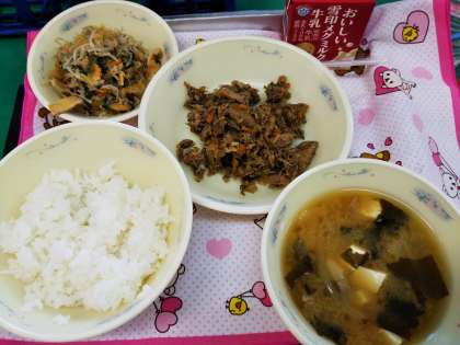 今日の献立はごはん・牛乳・さばめし(具)・もやしの煮びたし・みそ汁です。さばめしの具は、さばの水煮とごぼう・人参・干しいたけ・しょうがを炒めて甘辛く味つけしています。ごはんにのせて食べます。もやしの煮びたしは削り節のだしでほんのり甘く油あげを煮てにんじん・もやし・だいこん葉を加えて仕上げます。みそ汁もけずりぶしのだしで作るのでうま味があって子どもたちにも人気です。